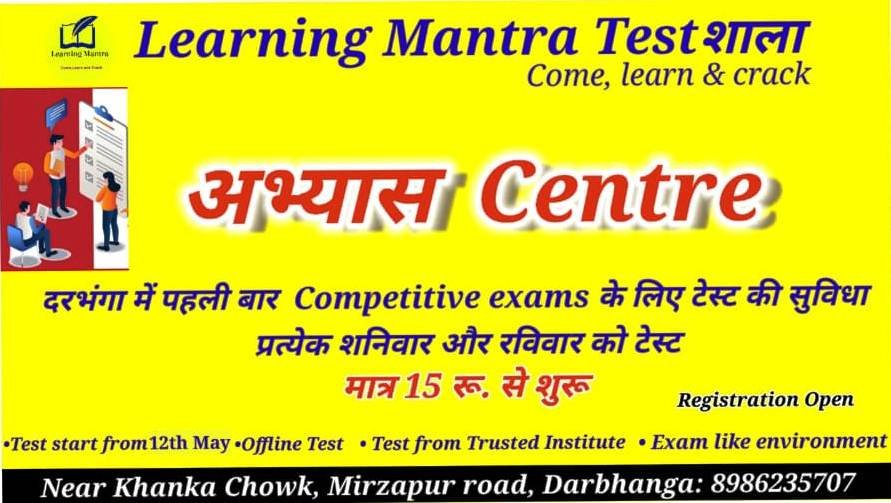 दरभंगा में पहली बार Competitive exams के लिए टेस्ट की सुविधा प्रत्येक शनिवार और रविवार को टेस्ट मात्र 15 रू. से शुरू Registration Open Test start from12th May Offline Test Test from Trusted Institute Exam like environment Near Khanka Chowk, Mirzapur road, Darbhanga: 8986235707