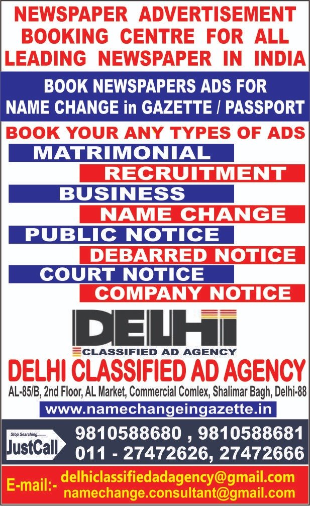 A name change generally refers to the act of a person adopting a new name different from their name at birth, marriage, or adoption. This can involve adding initials or even just changing one letter. Whether for personal preference or legal necessity, individuals often undertake this process to align their identity with their chosen name. Call for Querry Person: Nand Kishor Gupta (Manager) Business Development. Mobile No.- 9810588680