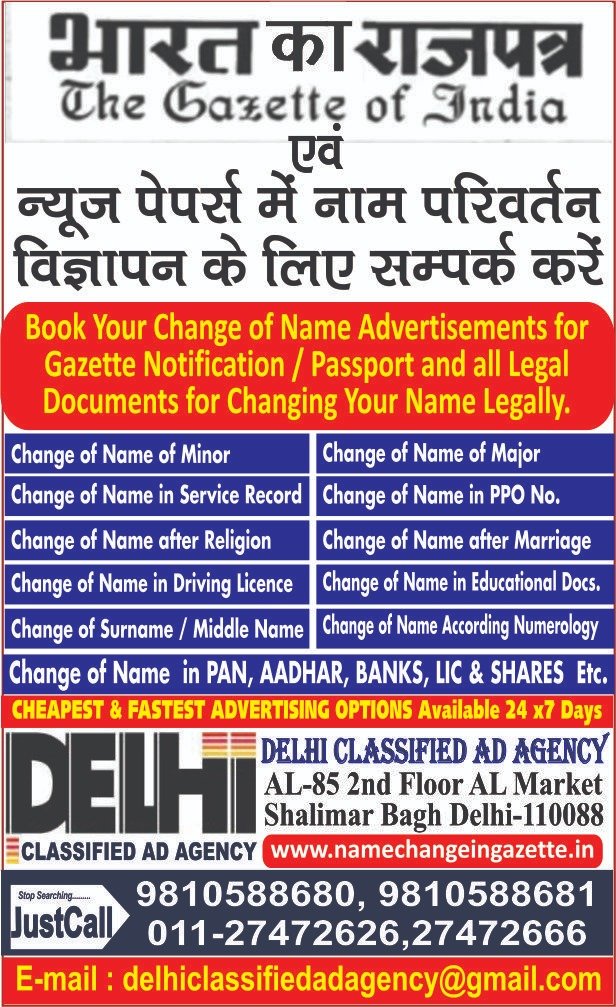AL-85/B, 2nd Floor, AL Market, Commercial Complex, Shalimar Bagh, Delhi-88 Website-www.namechangeingazette.in