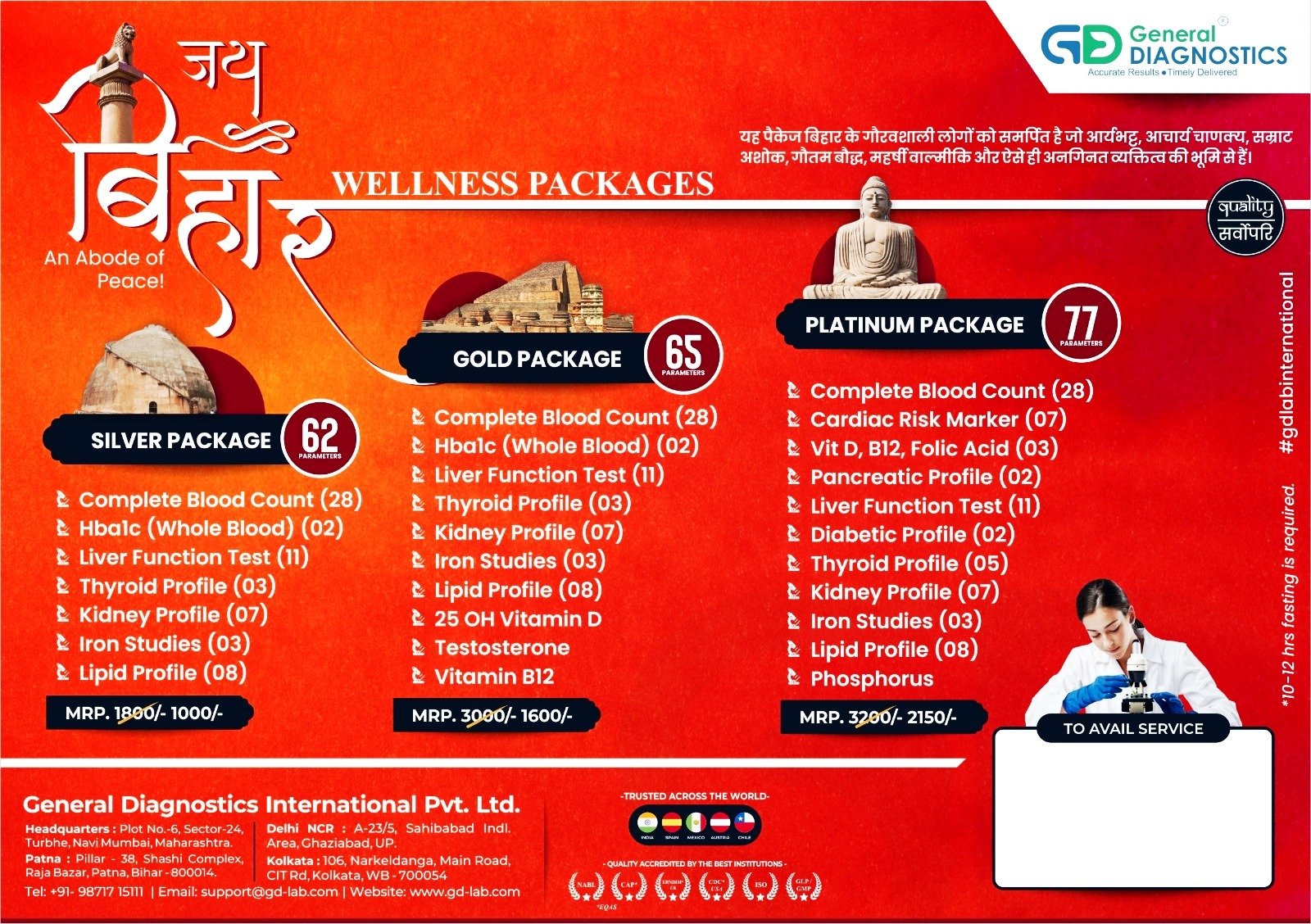 GD GENERAL DIAGNOSTICS in Darbhanga that offer various medical testing and imaging services to patients. These centers are equipped with modern equipment and staffed with skilled medical professionals. GD General DIAGNOSTICS is A Preventine Life Care Division Authorized Franchise Partner of Hi - Tech Diagnostic Darbhanga. GD GENERAL DIAGNOSTICS DARBHANGA provided blood tests, urine tests, X-rays, ultrasound, CT scans, MRI scans, and other specialized medical tests. we play a critical role in helping doctors diagnose and treat various medical conditions.
